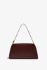 Burgundy leather shoulder bag from The Row. The Dalia evening bag features clean lines and a geometric silhouette. It is made of smooth goatskin leather with a top handle and zip closure, complete with an interior slip pocket.