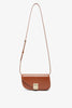 Light brown leather crossbody bag from Ferragamo. The Fiamma crossbody bag is made of calfskin leather, featuring an asymmetric front flap fastened by an iconic Gancio clasp. It has visible stitching around the edges along with a spacious, lined interior with flat pocket and slots for cards and documents.
