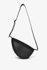 Black calf leather bag from The Row. The small Slouchy banana bag is made from black calfskin leather, featuring a suede-lined interior and adjustable shoulder strap complete with a silver zipped top.
